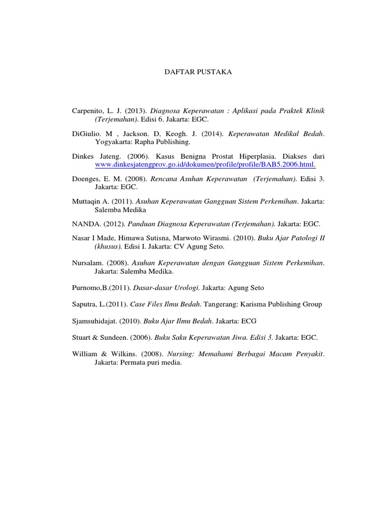 Keperawatan Medikal Bedah Menajemen Klinis untuk Hasil Yang Diharapkan. Salemba Medika Kozier B 2009. Buku Ajar Keperawatan Medikal Bedah Edisi 8 volume 2.