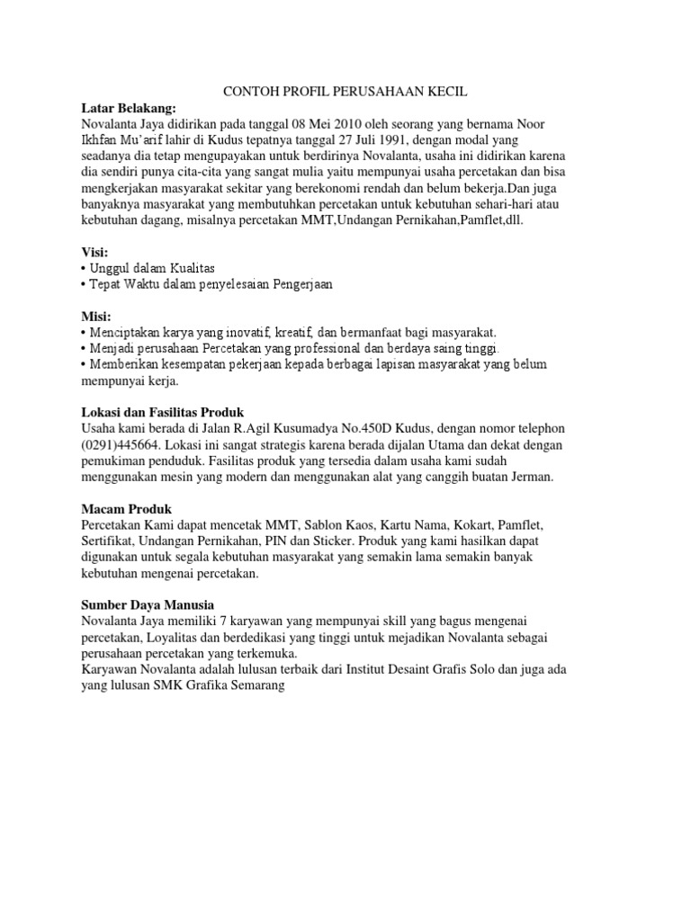 Profil perusahaan semacam ini dirasa mampu meningkatkan nilai perusahaan di antara pesaing lainnya guna memberikan pengaruh bagi calon pelanggan lain. CONTOH PROFIL PERUSAHAAN KECIL Latar Belakang. Anda membutuhkan profil perusahaan jika Anda ingin mendapatkan modal dan memenangkan investor tetapi Anda juga.