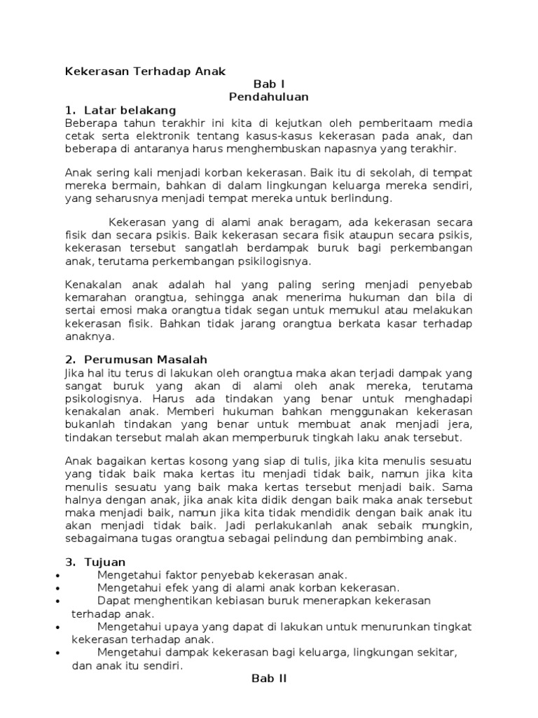 Contoh skripsi tentang kekerasan terhadap anak. Sebuah fakta yang mengejutkan yaitu seorang anak di Malang disiram air panas oleh ibunya sendiri. HISTORI REVIEW Atik Murwati SPsi MPsi Psikolog Alumni Magister Profesi Psikologi Universitas Muhammadiyah Surakarta Abstrak Penelitian tentang kekerasan seksual pada anak cukup banyak dilakukan mengingat fenomena ini sudah sampai tahap yang mengkhawatirkan. Pieter andreas 0801605006 program studi antropologi fakultas ilmu budaya universitas udayana denpasar 2016.