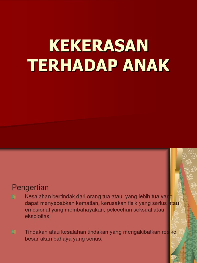 Gelles Hurairah 2012 kekerasan terhadap anak merupakan perbuatan disengaja yang menimbulkan kerugian atau bahaya terhadap anak-anak baik secara fisik maupun emosional. Anak mencapai 1208 kasus kekeras- -----. Sanksi Kekerasan Anak Anak merupakan titipan Tuhan kepada sebuah keluarga yang harus dijaga dan dilindungi.