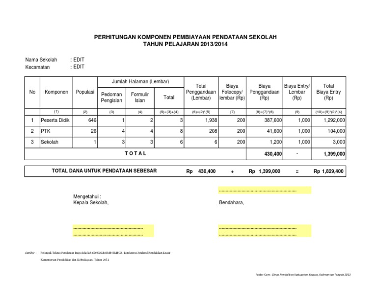 Dan untuk Pembiayaan Entry di Aplikasi Pendatan Dapodikdas 2013 untuk Operator Sekolah sebagai berikut rinciannya. Pembaruan Penambahan validasi variabel yang wajib diisi. Contoh bentuk dan format perhitungan komponen pembiayaan dapat mengikuti contoh format sebagai berikut sebagai contoh perhitungan biaya pendataan dengan jumlah siswa sebanyak 137 siswa PTK sebanyak 9 orang biaya untuk penggandaan Rp.